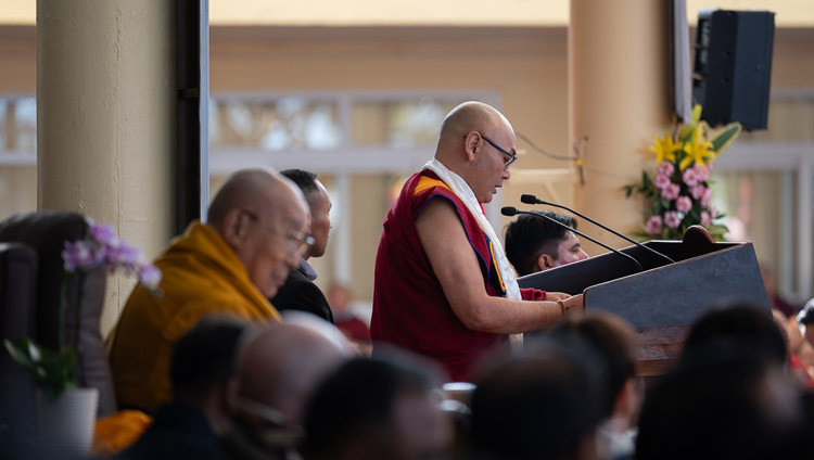 Сикьонг Пенпа Церинг зачитал заявление кашага по случаю сегодняшнего события – сначала на тибетском, затем на английском языке. В первую очередь он отметил, что этот знаменательный день, 75-я годовщина со дня восшествия Далай-ламы на престол духовного и светского правителя Тибета, также отмечается в рамках Года сострадания, посвященного 90-летию Его Святейшества.
