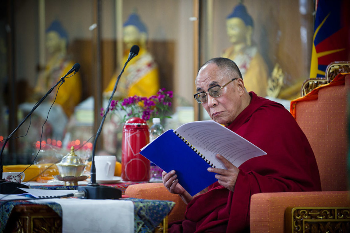 Его Святейшество Далай-лама знакомится с годовым отчетом о работе Института тибетской медицины и астрологии. Дхарамсала, Индия. 23 марта. Фото: Тензин Чойджор (Офис ЕСДЛ)