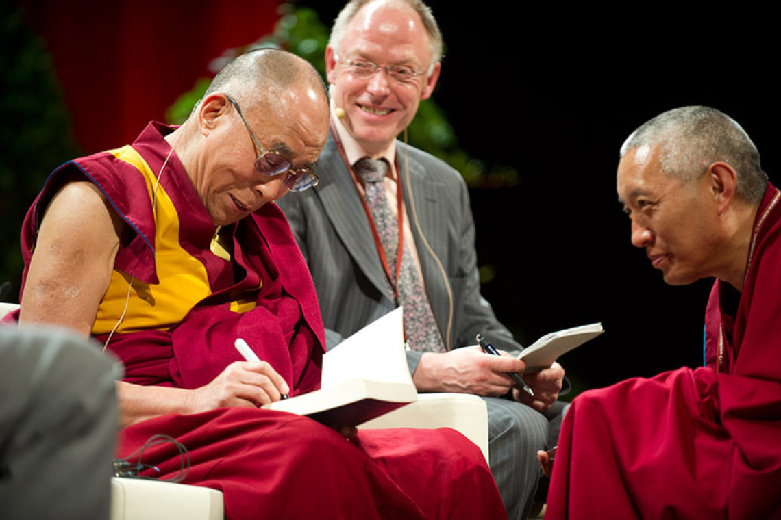 Его Святейшество Далай-лама подписывает книги для своих слушателей во время встречи "Мир и всеобщая ответственность". Зальцбург, Австрия. 21 мая 2012 г. Фото: Тензин Чойджор (Офис ЕСДЛ)